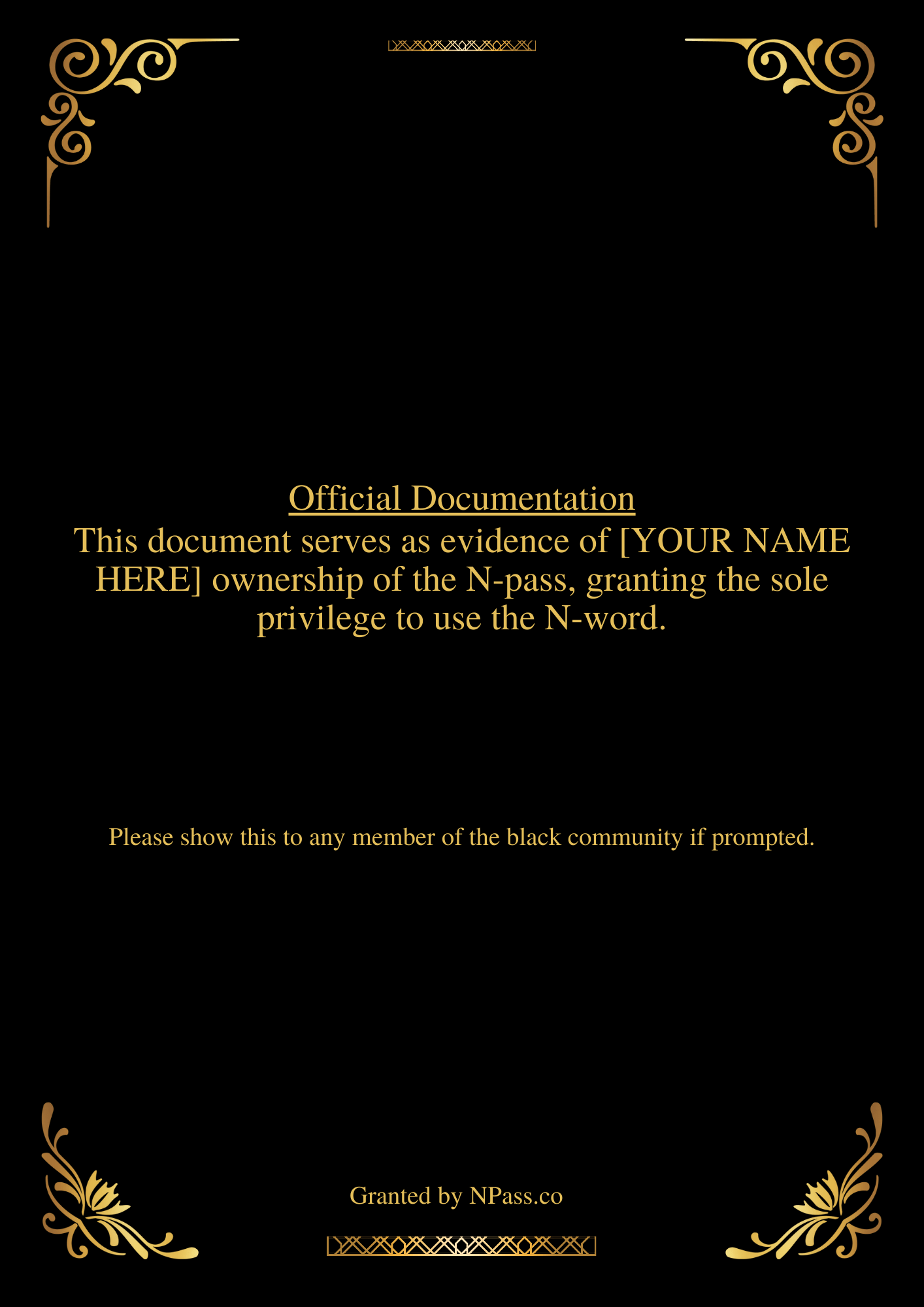 With the N-Pass you now officially have permission to say the N-Word. Please use it responsibly.